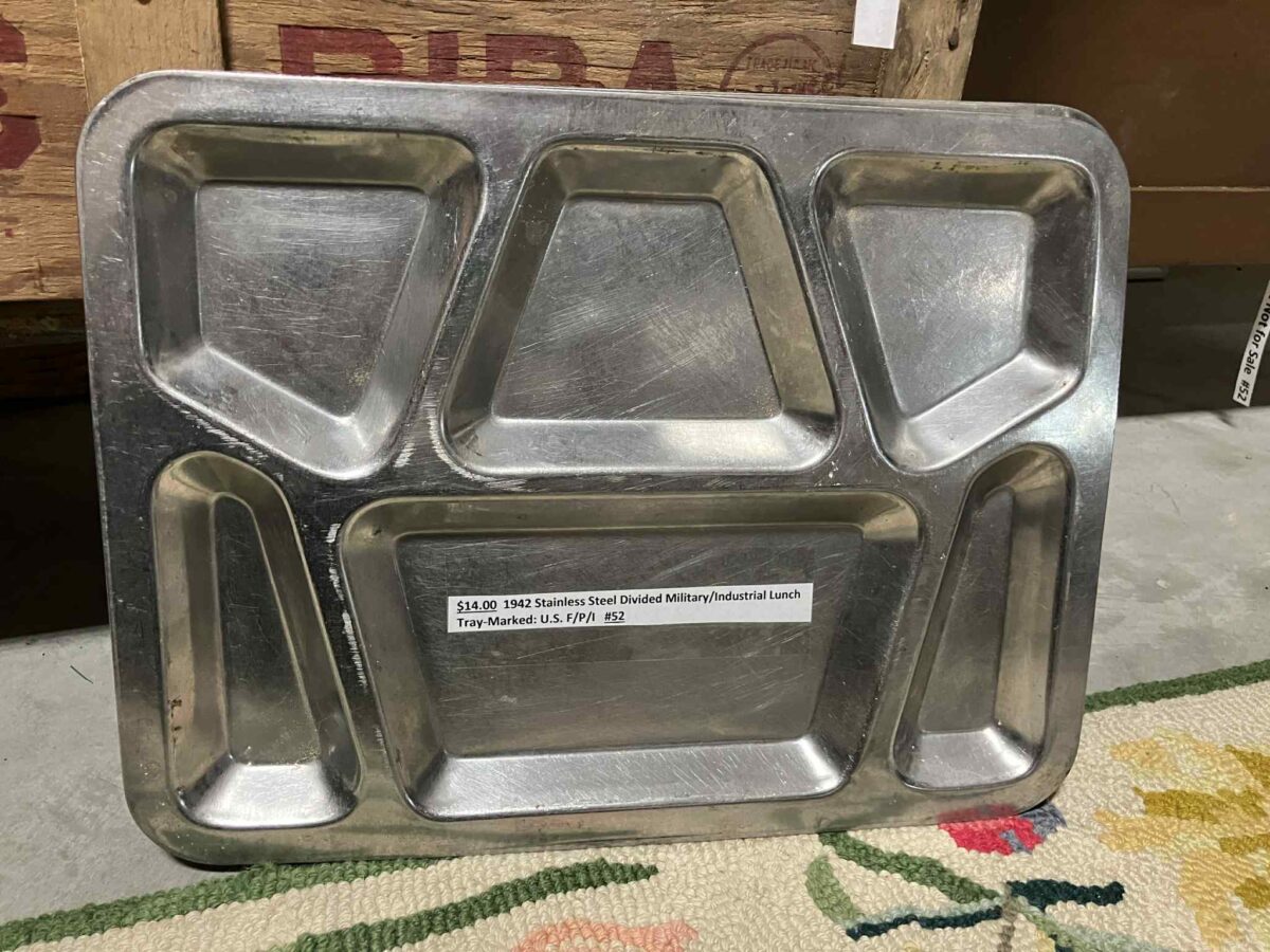 $14, 1942 Stainless steel divided military/industrial lunch tray. Marked: U.S. F/P/I by #52 Inter Urban Antiques