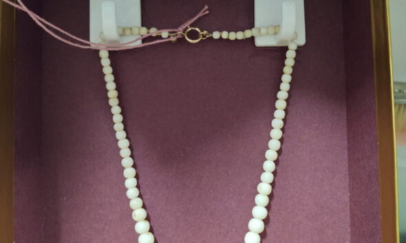 $145, 1920’s “Angel Skin” coral necklace -15″ 25.5g of natural hand carved graduated round beads with spring ring closure