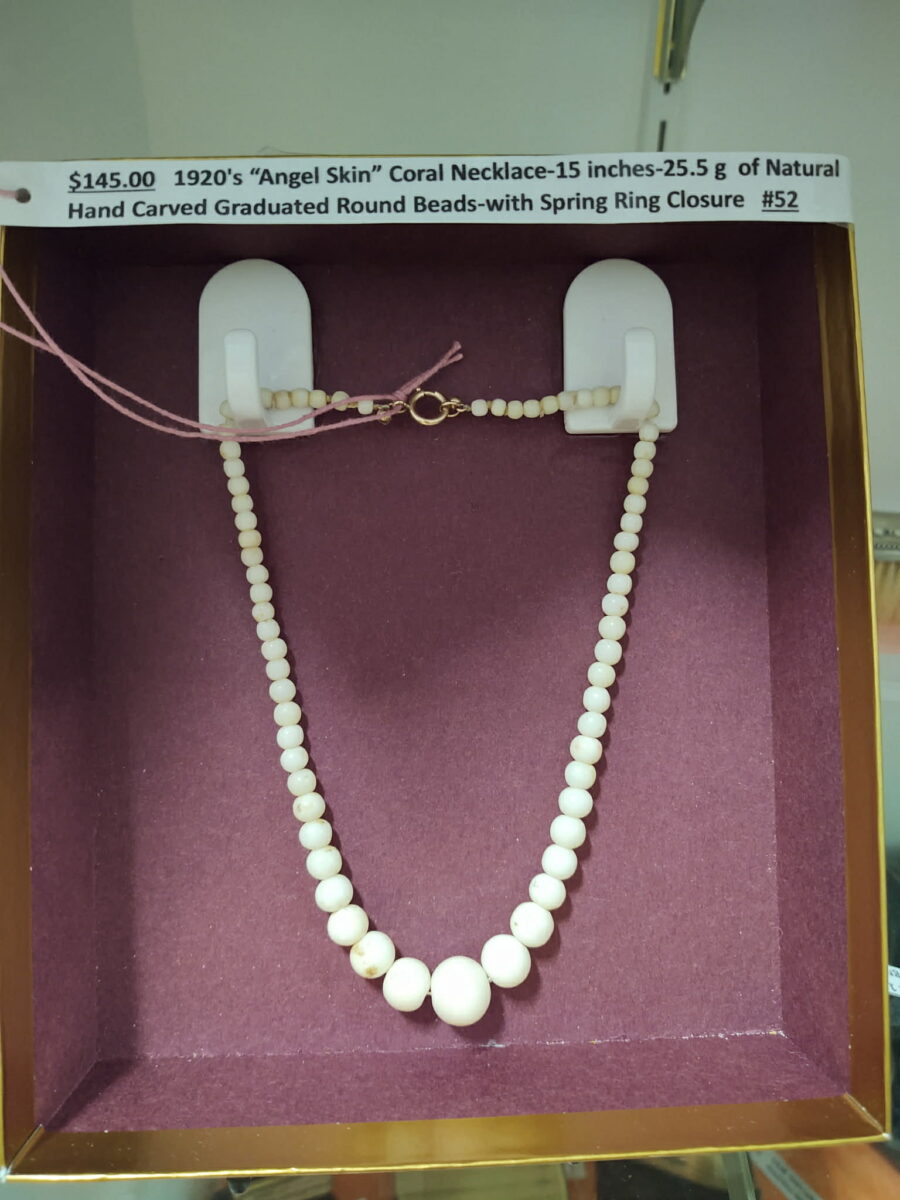 $145, 1920’s “Angel Skin” coral necklace -15″ 25.5g of natural hand carved graduated round beads with spring ring closure by #52 Inter Urban Antiques