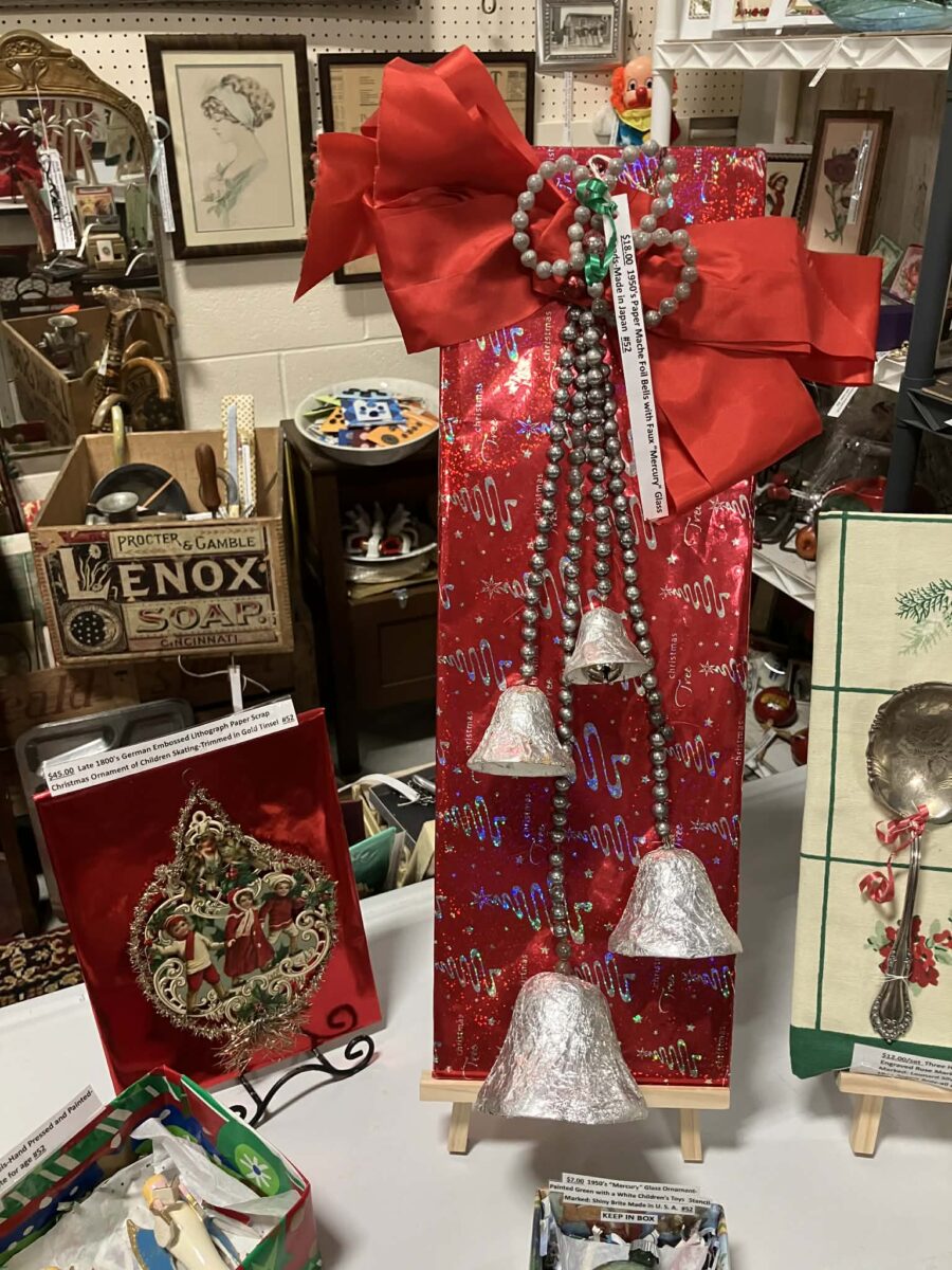 $18, 1950’s Paper Mache foil bells with faux “mercury” class beads, made in Japan. $45 Late 1800’s German embossed lithograph paper scrap Christmas ornament of children skating – trimmed in gold tinsel. Both items by #52 Inter Urban Antiques