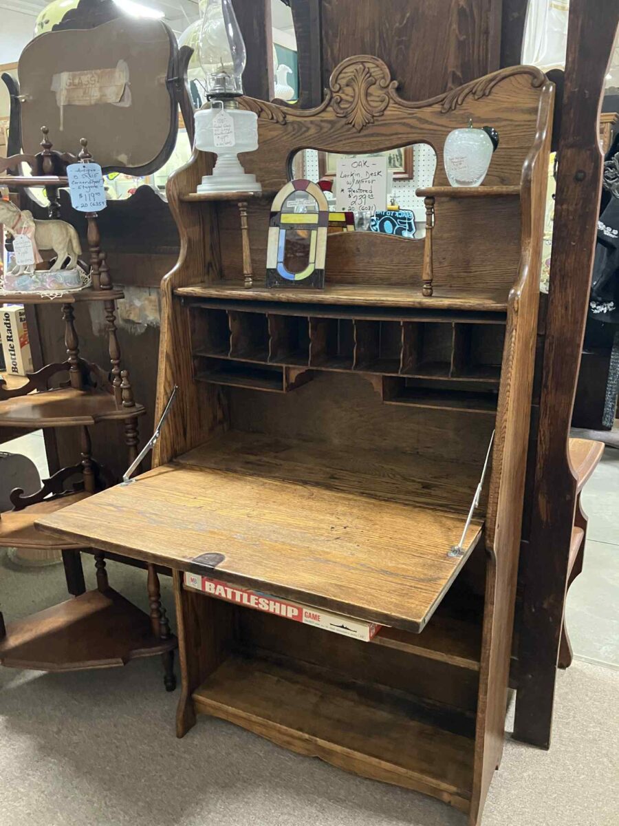$239 Restored Oak Larkin Desk with mirror. Additional items in photo: $14 Apple art glass paperweight. $9.50 Wurlitzer stain glass jukebox. $49, 1880’s Frosted glass oil lamp Acanthus leaves. Items for sale by #20 John.