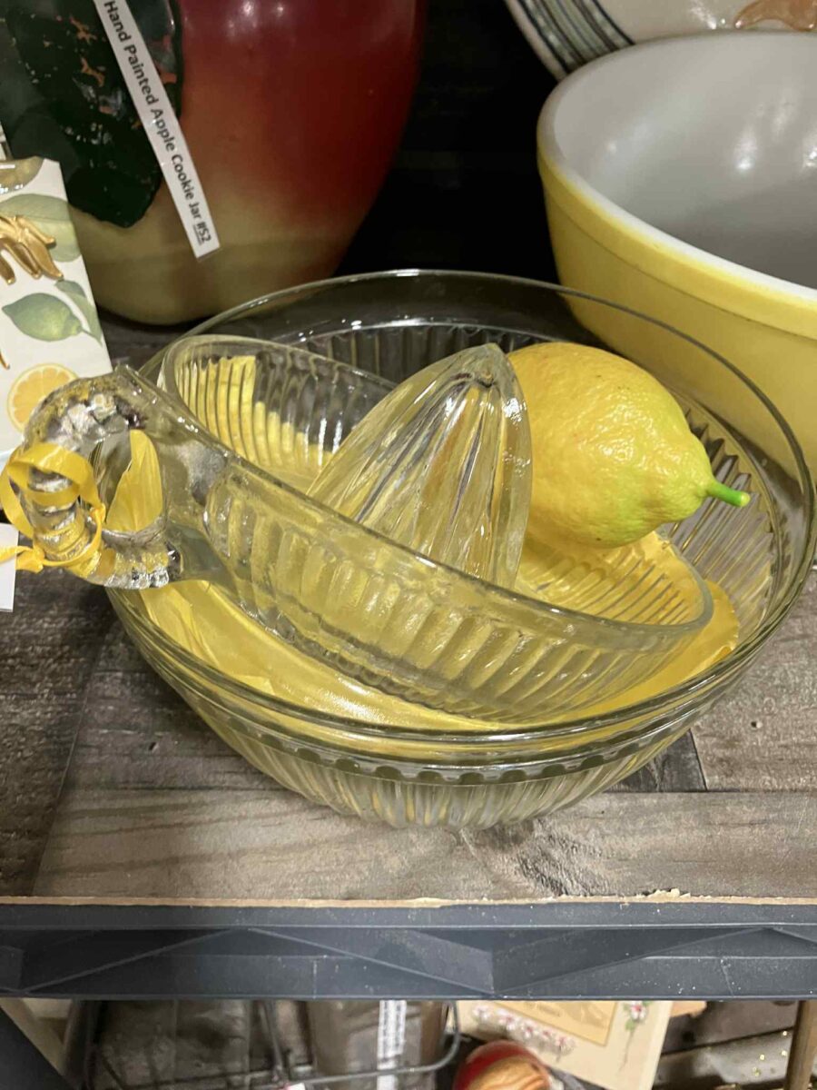 $25, 1930’s Citrus juicer – matching ribbed reamer and bowl – good condition by #52 Inter Urban Antiques