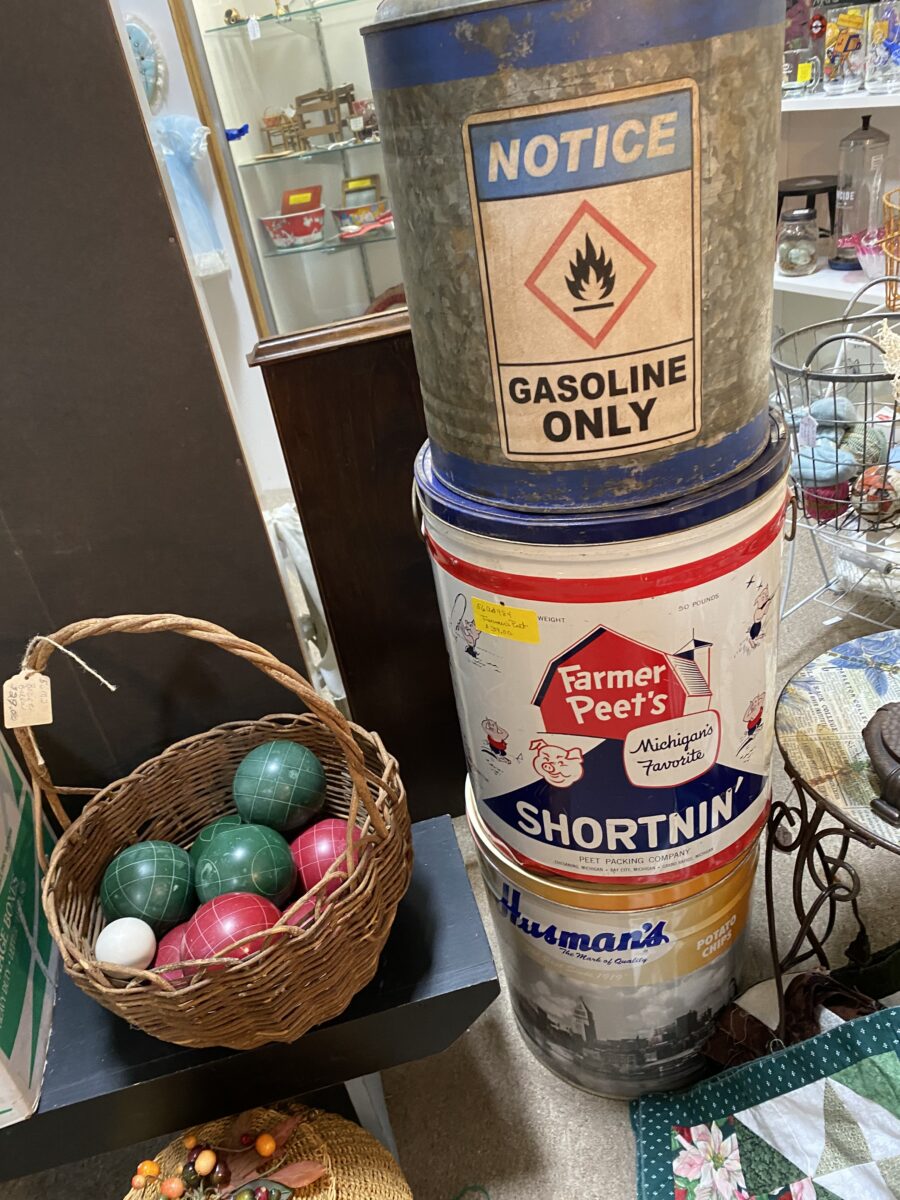 These advertising large tins include gasoline, potato chips, and shortening. DEALER 56 CAN BE REACHED AT mitricity@aol.com