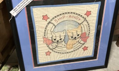 $80, 1940’s Framed Yogart pillow top “Two Kittens with Bows SHIP-AHOY” embroidered on stamped and tinted linen