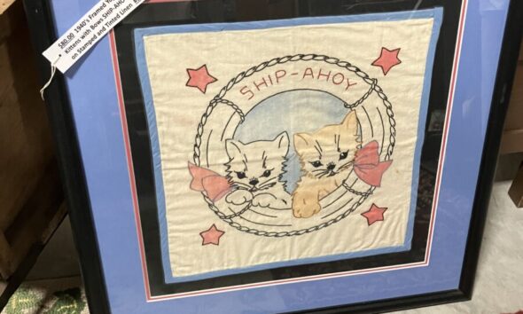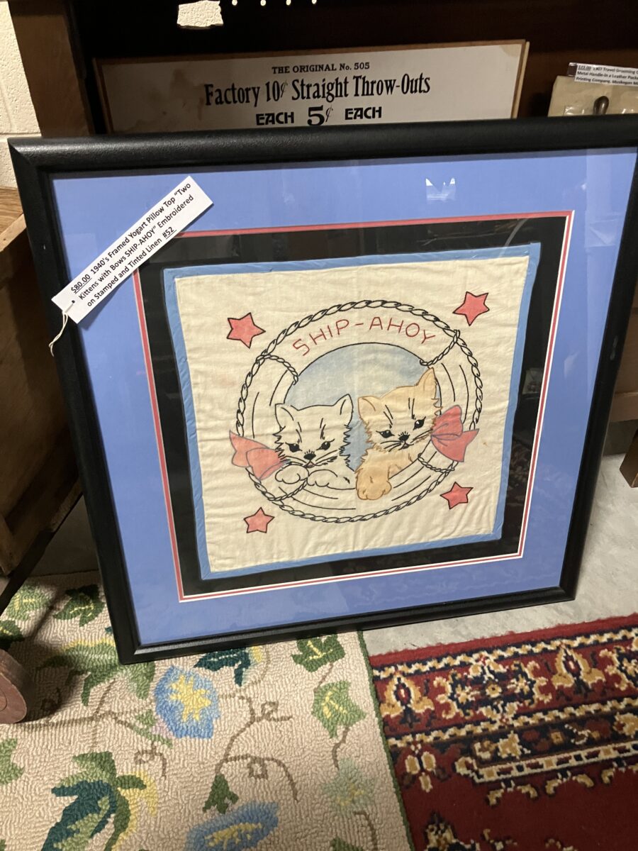 $80, 1940’s Framed Yogart pillow top “Two Kittens with Bows SHIP-AHOY” embroidered on stamped and tinted linen by #52 Inter Urban Antiques
