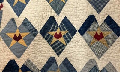 $65, 23″ square hand quilted “Hearts & Stars” wall hanging by #26 D&D