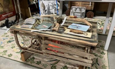 $400/set Vintage “Lobster Trap” coffee table with glass top paired with signed 2003 TINCHI bronze/glass lobster lamp (barn wood base and shells included) by #52 Inter...