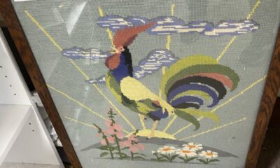 The rooster is needlepoint with an oak frame. Cost is $89.00. DEALER 56 CAN BE REACHED AT mitricity@aol.com