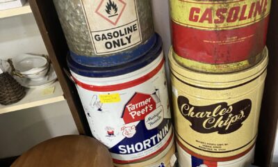 These advertising large tins include gasoline, potato chips, and shortening. DEALER 56 CAN BE REACHED AT mitricity@aol.com