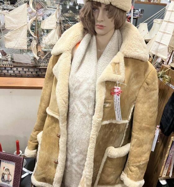 $50, 1940’s Black shear rabbit fur coat. Label reads, “Fox fur shop- fine furs- Saginaw.” Has original embossed black satin lining and buttons. $18/set, Vintage back...