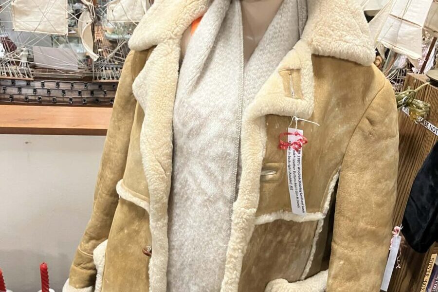 Updated as sold 1/13/26 $75, 1990’s Sundance brown weathered leather pea coat, size medium by #52 Inter Urban Antiques Also in the photo: $18/pair Mid-Century brown...