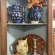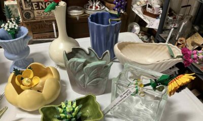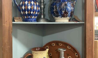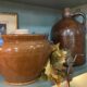 $18, 8″ x 11″ oval Redware plate. $46, 7″ SJ Pottery Redware sgraffito pitcher. $22, 7″ brown, white, blue harlequin pattern pitcher Germany. $18, 7″ Brown...