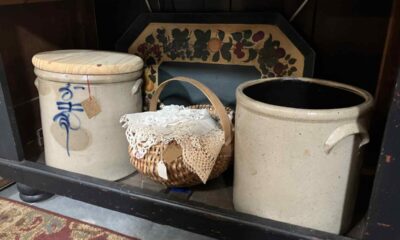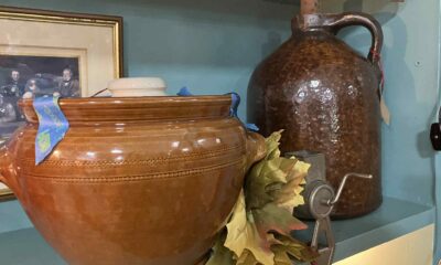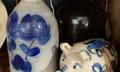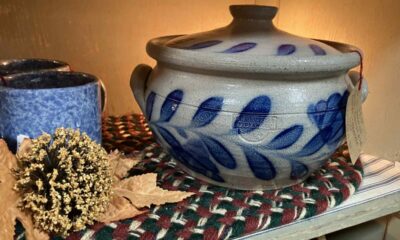 $22 English Casserole from Pearson of Chesterfield. $6 non-matching lid. $85, 2 Gallon salt glaze whiskey jug. Items for sale by #26 D&D.