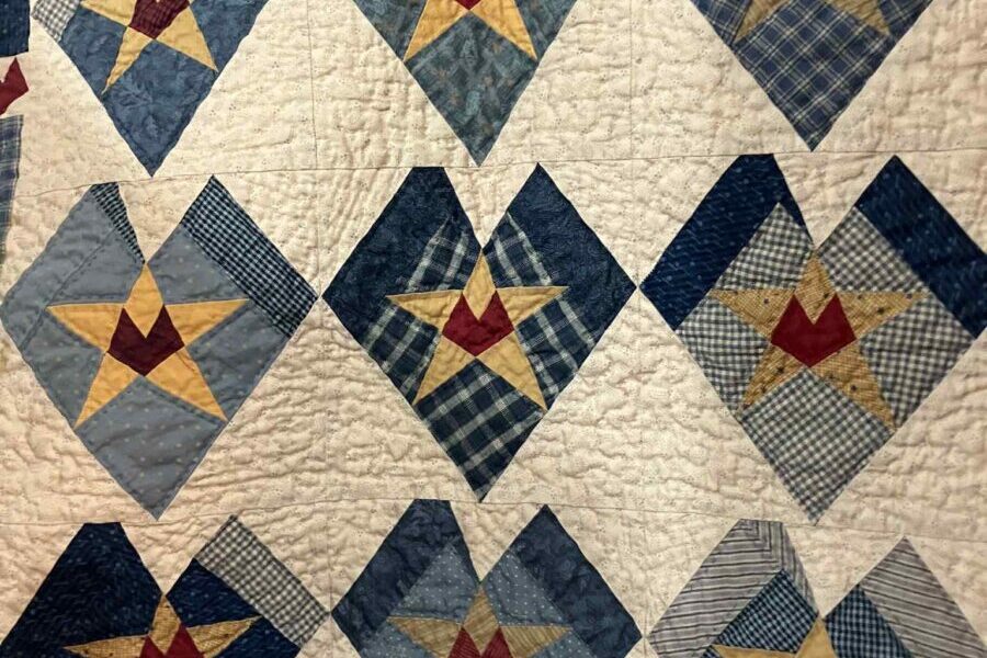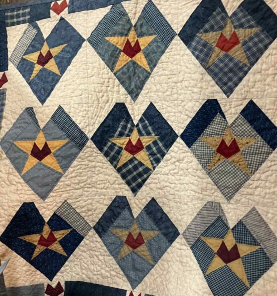 $65, 23″ square hand quilted “Hearts & Stars” wall hanging by #26 D&D