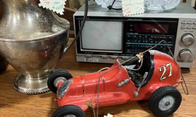 $135 Red Roy Cox thimble drone champian race car. $14 Pitcher sip over copper. $42 Cut glass sugar bowl & creamer. $37.50 GPX TV radio 12v-120w....