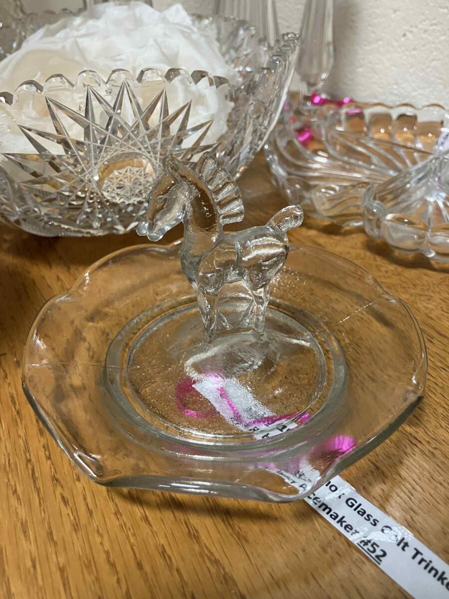 $12, 1930’s Knox glass colt trinket dish – clear pressed glass designed by K.R. Haley Pacemaker by #52 Inter Urban Antiques.