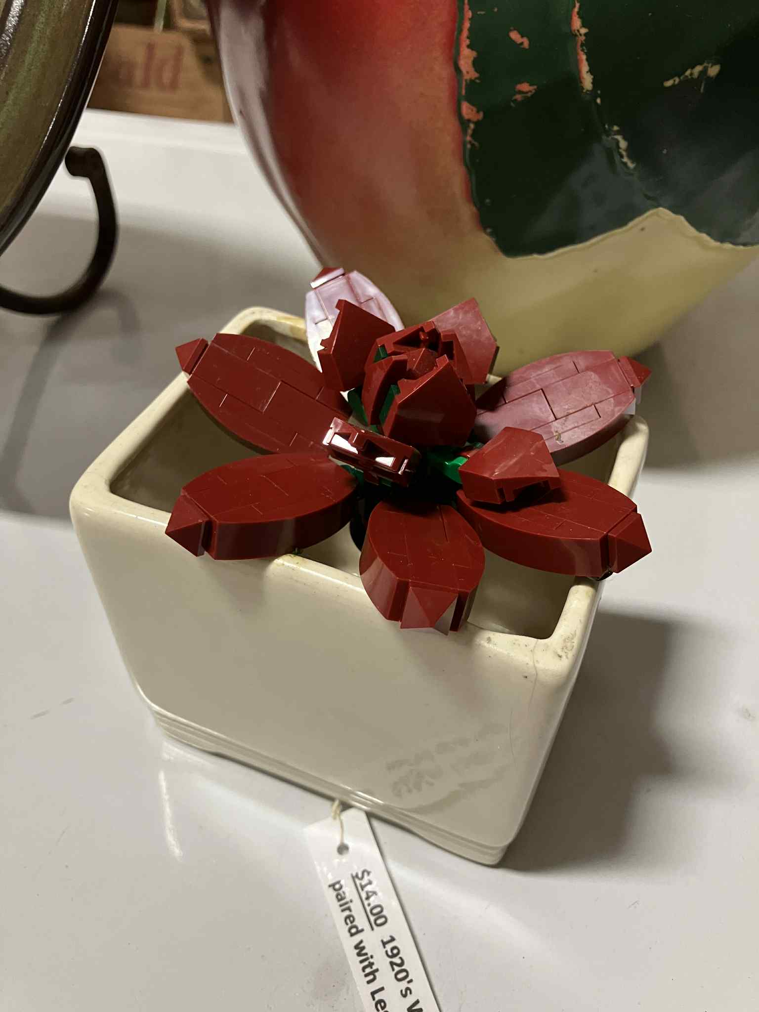 $14, 1920’S White rectangular planter with a raised unmarked base- paired with Lego red echeveria flower by #52 Inter Urban Antiques